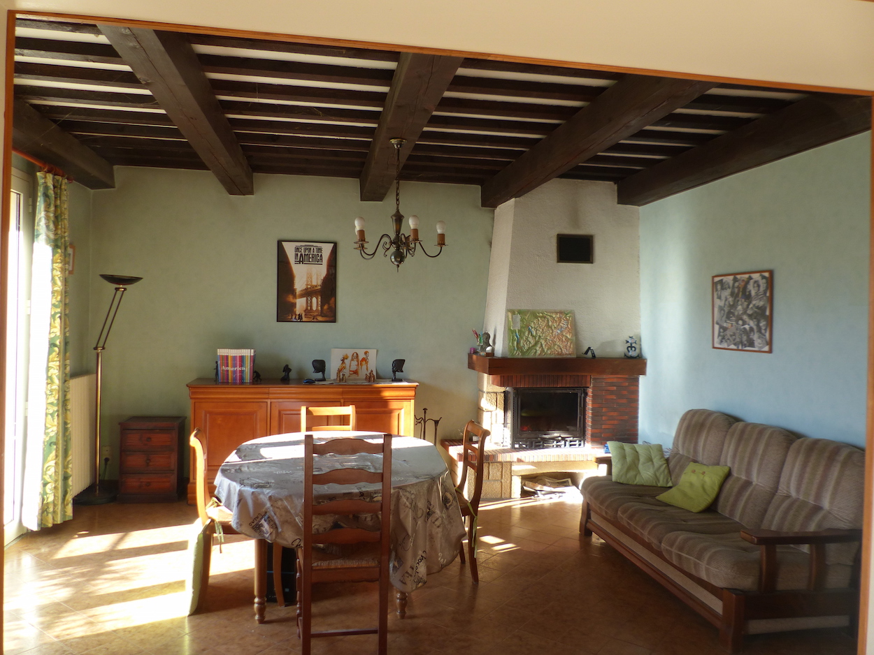 Au 1 étage: Belle pièce de vie avec cheminée de 40 m2, une Cuisine équipée, deux chambres ( une troisième à rénover) , une salle de bain, un wc indépendant,